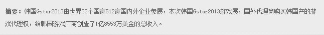 韩国Gstar2013由世界32个国家512家国内外企业参展,本次韩国Gstar2013游戏展,国外代理商购买韩国产的游戏代理权,给韩国游戏厂商创造了1亿8553万美金的总收入。比去年增长25.4%。其B2B馆展示面积也大幅增加,去年有314家企业参展,今年增加至380家企业参展。参加Gstar的付费客户也从去年的840人增加至1397人,成为了韩国付费客户参加最多的展览会。