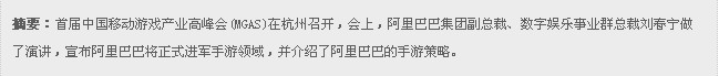 1月8日,首届中国移动游戏产业高峰会(MGAS)在杭州召开,会上,阿里巴巴集团副总裁、数字娱乐事业群总裁刘春宁做了演讲,宣布阿里巴巴将正式进军手游领域,并介绍了阿里巴巴的手游策略。