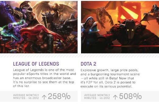 有意思的是,这份数据中,Twitch还特意将《英雄联盟》的观看人数涨幅与《DOTA2》的数据放在了一起。《英雄联盟》在2013年观看人数涨幅为258%。这一数字远不及《DOTA2》,却也在情理之中。《英雄联盟》从2011年发行到现在已经取得了许多辉煌的成绩,我们不应该再去苛求他能取得怎样的进步。况且,258%的增幅也已经非常不容易。