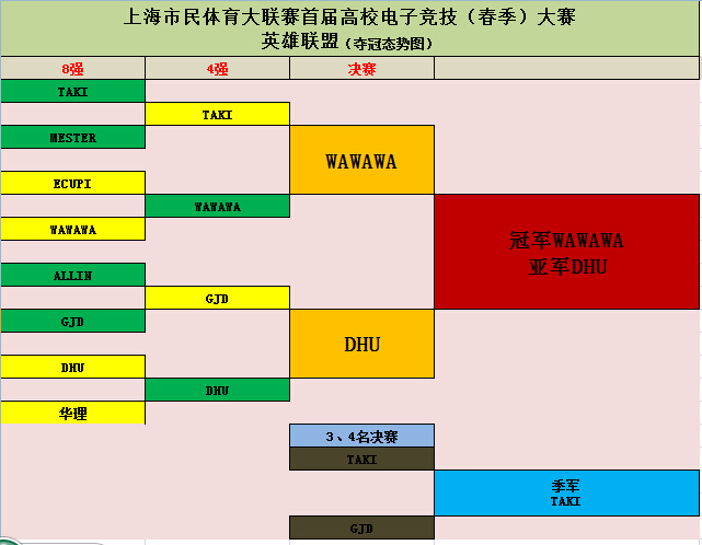 下面是成绩公布:英雄联盟 冠军战队 WAWAWA,亚军 DHU战队,季军 TAKI战队