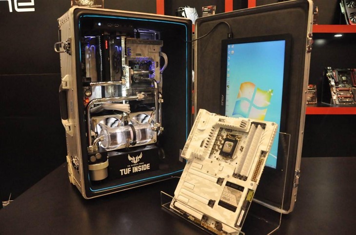 在产品体验区还有一个与众不同的MOD作品吸引了大量观众眼球,这款由国内知名MODDER魏筝(AI-MASK)手工打造,使用德国知名旅行箱制造商RIMOEWA Tropicana摄影器材箱进行改装,华硕TUF特种部队系列最新限量典藏版主板SABERTOOTH Z97 MARK S完美融入其中,散热方案使用全套定制化水冷套件。无论是视觉冲击力还是实际性能表现都可以说是2014年众多MOD作品的标杆。
