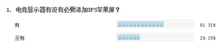 之后我们对产品的屏幕进行了调研。目前电竞显示器的屏幕材质,主要是TN屏幕,这种屏幕结构简单反应速度快,但是色彩效果并不好,加上视角不够宽广,如今除了在电竞显示器上使用,基本上在中高端产品上,已经很难见到这样的面板了。对于玩家的调查也显示,61.31%的用户认为有必要加入IPS苹果屏。这种屏幕视角宽广,颜色表现也更好,用来玩游戏也是不错的选择。