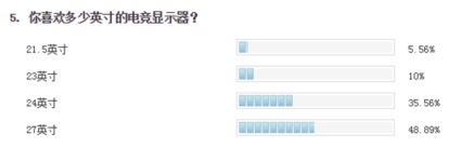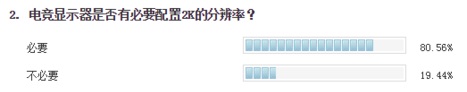 关于分辨率的调查,我们也是提供了常见的1080P和2K的选项。很显然80.56%的用户都更加喜欢2K的分辨率,这种结果也是非常的正常的。毕竟如今手机的分辨率都已经达到了1080P甚至是2K的级别,用户对于屏幕细腻的挑剔程度,已经被逐渐的培养了出来。因此对于显示器这种大屏幕的产品来说,2K分辨率是一个和好的选择,1080P细节不够,4K有显得资源浪费。