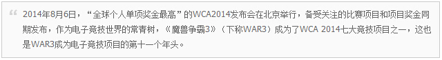 2014年8月6日,“全球个人单项奖金最高”的WCA2014发布会在北京举行,备受关注的比赛项目和项目奖金同期发布,作为电子竞技世界的常青树,《魔兽争霸3》(下称WAR3)成为了WCA 2014七大竞技项目之一,这也是WAR3成为电子竞技项目的第十一个年头。