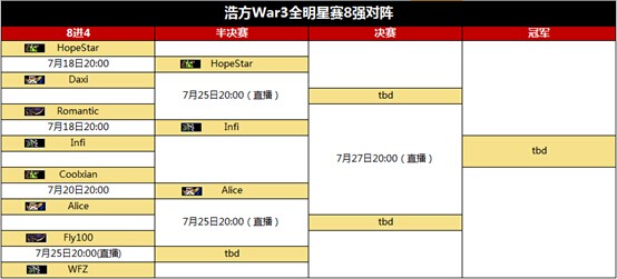浩方War3全明星赛在历经三周精彩对决之后,3名明星选手HopeStar、Infi和Alice已脱颖而出进入全明星半决赛,最后一名半决赛选手将于7月25日20点在Fly100和WFZ中决出,晋级半决赛四人在之后终极角逐最终全明星决赛,晋级赛事都于每周五和周日在战旗TVCaptain专房全程直播。