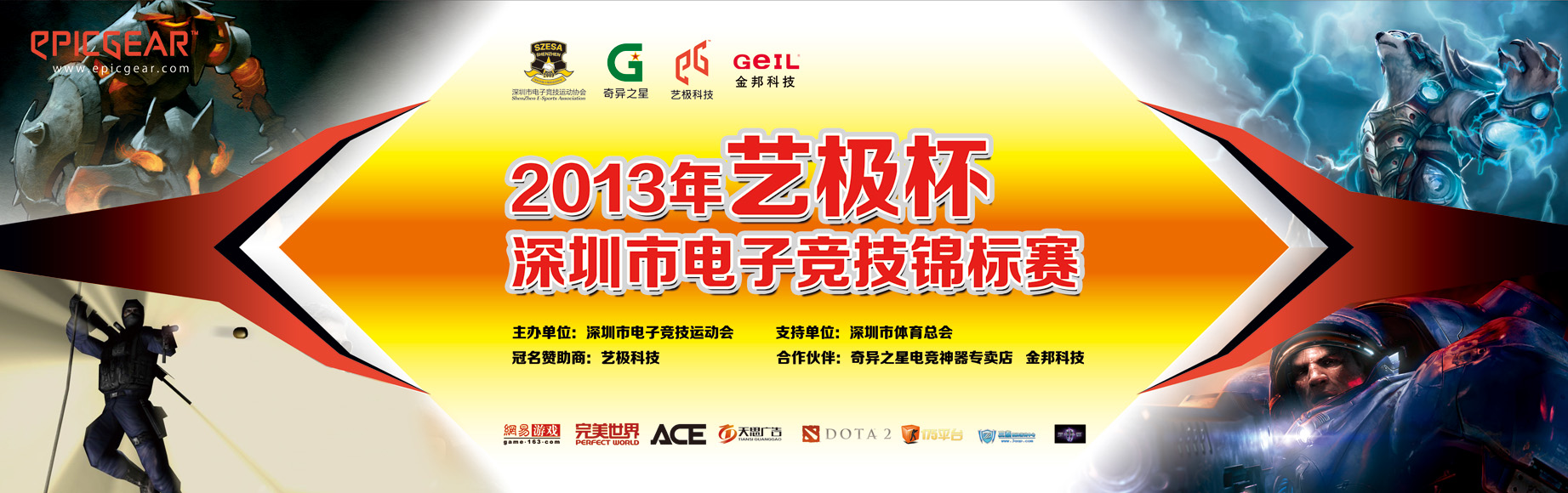 在10月19日开赛的2013年“艺极杯”深圳市电子竞技锦标赛,共有DOTA2、SC2、CS1.6、斗地主、LOL比赛项目。为电子竞技玩家提供了总价值达15万元的奖金+奖品,我们将为敢于亮剑、敢于拼搏的玩家提供大量奖品,用于激励为电子竞技荣耀而战斗的普通玩家。玩家在任何媒体、贴吧,只要报名参赛并参与互动活动就有机会获得“艺极”鼠标、键盘、鼠标垫等电竞装备,以及点卡、t恤等游戏周边。(100%中奖,运气最差都能获得安慰奖)