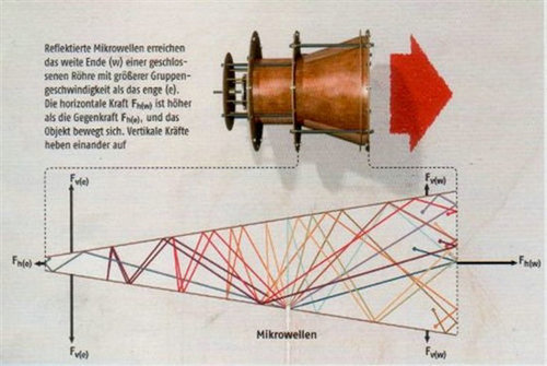 Drive的设计中,封闭的截锥状 (truncate cone) 推力器 (thruster) 腔体一端由微波 (microwave) 通过波导 (magnetron) 被辐射进入,之后作用在腔体表面上,并沿推力器轴线 (见上图) 产生净推力。和目前航天器所使用的燃料助推器相比,EmDrive 的在Em工作原理截然不同。