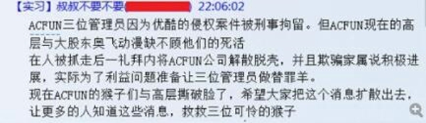 然而这并没有为A站带来起色。2014年,A站出现内讧,“大猴子”原站长赛门和投资方意见不合离职。2015年,AcFun遭到优酷土豆起诉,并提出用股权和1800万现金的赔偿,原高管遭刑拘,原技术团队和高层大部分离开AcFun,员工集体离职。