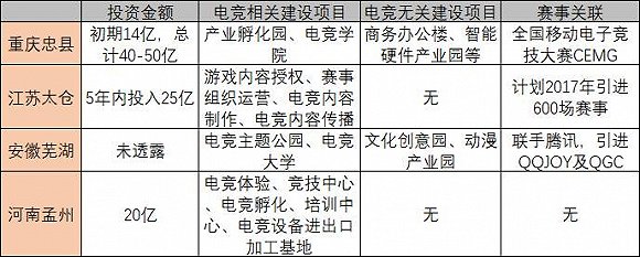 电竞小镇火热开建。4月,重庆忠县宣布联合大唐电信投资14亿打造国内第一家电竞小镇,并将成为未来5年内全国移动电子竞技大赛CMEG的总决赛地点。而这之后,短短两个月的时间内,除重庆忠县外,江苏太仓、安徽芜湖、河南孟州等三地纷纷宣布投入巨额资金建设电竞小镇的计划。
