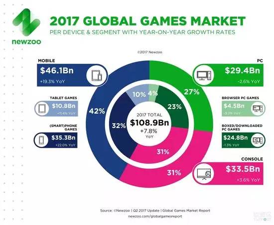 包含平板和智能手机游戏在内的移动游戏在游戏市场中的比重达到42%,其同比增幅分别达到了11.4%和22%。主机游戏的同比增幅仅有3.6%,而下载 PC 游戏则出现了1.3%的下滑。预计到2020年,移动游戏的份额将增加到50%,在此前五年内,它的年均增幅将达13.9%。