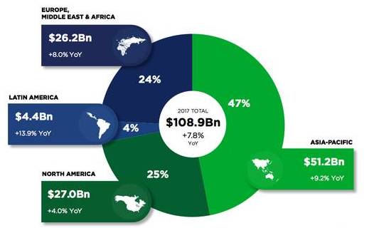事实上,除了游戏玩家基础雄厚、游戏市场稳固的北美市场之外,亚太、欧洲及拉美游戏市场的同比增长都超过了整个市场的增幅(7.8%),现在,亚太在整个游戏市场中占据了47%的比重。尤为引人注意的是,只占了4%份额的拉美市场的同比增幅达到了惊人的13.9%。
