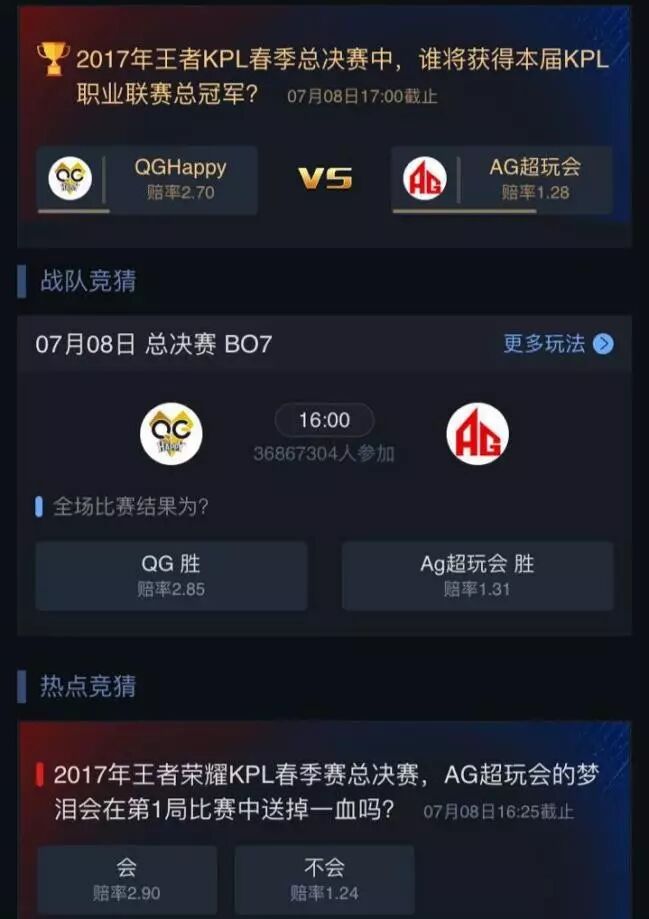 在比赛期间,所有玩家均可下注,热门场次吸引数白万玩家下注十分容易。去年总决赛上,AG超玩会与AS仙阁的对决就曾吸引超过1000万玩家下注竞猜。记者身边一位资深玩家在去年KPL总决赛上投入十多万竞猜币预测仙阁获胜,获得了丰厚的竞猜币回报。