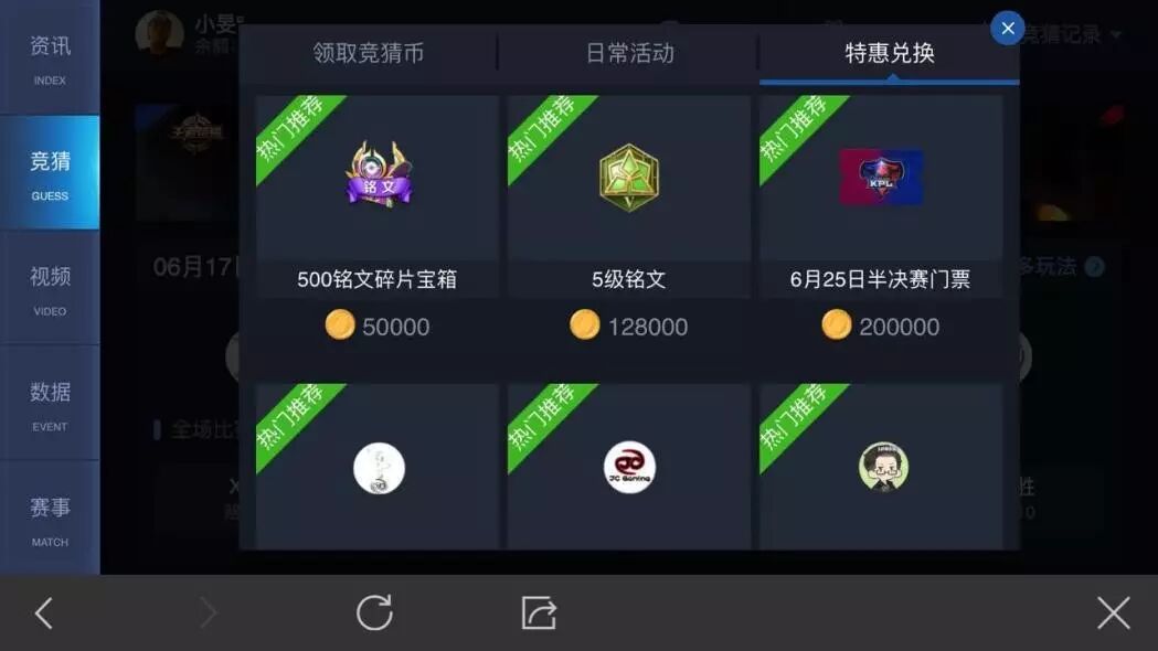除了第三方“菠菜平台”以外,一些游戏也在内部设置了竞猜环节。《王者荣耀》游戏中,玩家可以就KPL赛事进行竞猜,用来参与竞猜的竞猜币可以靠日常游戏活动取得。竞猜币积累到一定程度后,还可以在商店中换取稀有道具。