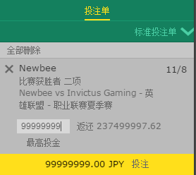 在投注中,玩家可以选择标准式投注与Bankers式投注,以日元为例,一次下注最高投99999999.00日元,约合人民币600余万元。