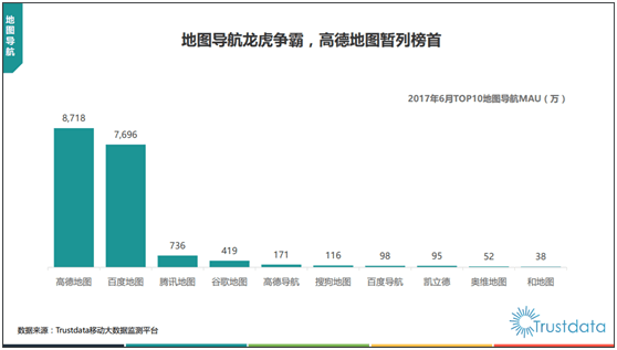 在地图导航领域的竞争中,高德地图2017年6月份以8717万的MAU成绩,继续位列榜首。