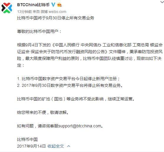 比特币中国9月14日晚间在其官方微博发布公告称,根据9月4日下发的《中国人民银行 中央网信办 工业和信息化部 工商总局 银监会 证监会 保监会关于防范代币发行融资风险的公告》文件精神,秉承着防范投资风险,最大限度保障用户利益的原则,比特币中国团队经慎重讨论,现做出如下决定:1. 比特币中国数字资产交易平台今日起停止新用户注册;2. 2017年9月30日数字资产交易平台将停止所有交易业务。比特币中国的矿池(国池)等业务将不受此影响,继续正常运营。